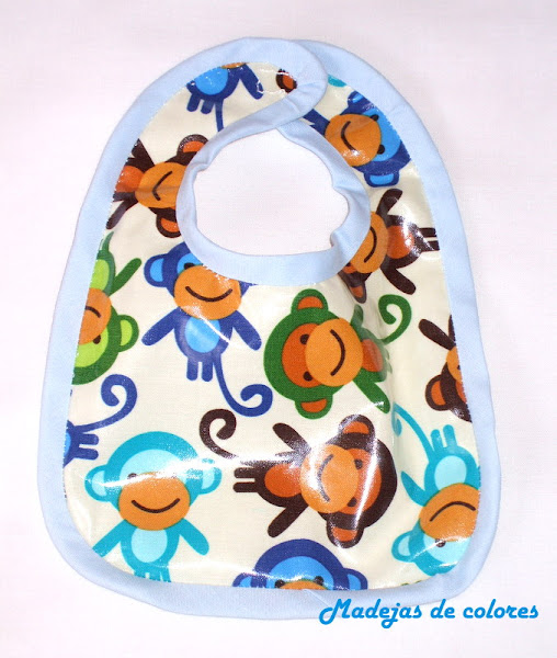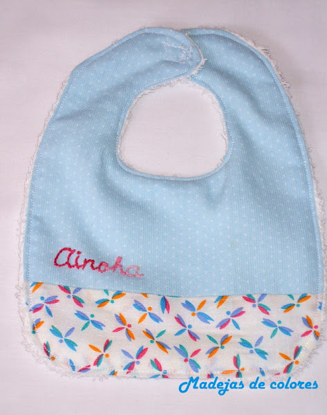 Lo primero que hice fue unos baberos. Uno de tela plastificada, que tenia de otro trabajo anterior y el otro combinando una tela de piqué celeste con topitos blancos, con otra de libélulas de colores y felpa en su trasera. Le bordé el nombre a un lado, con ovillo matizado.