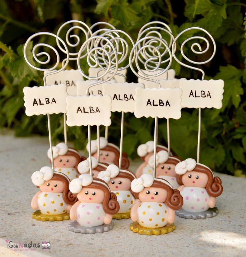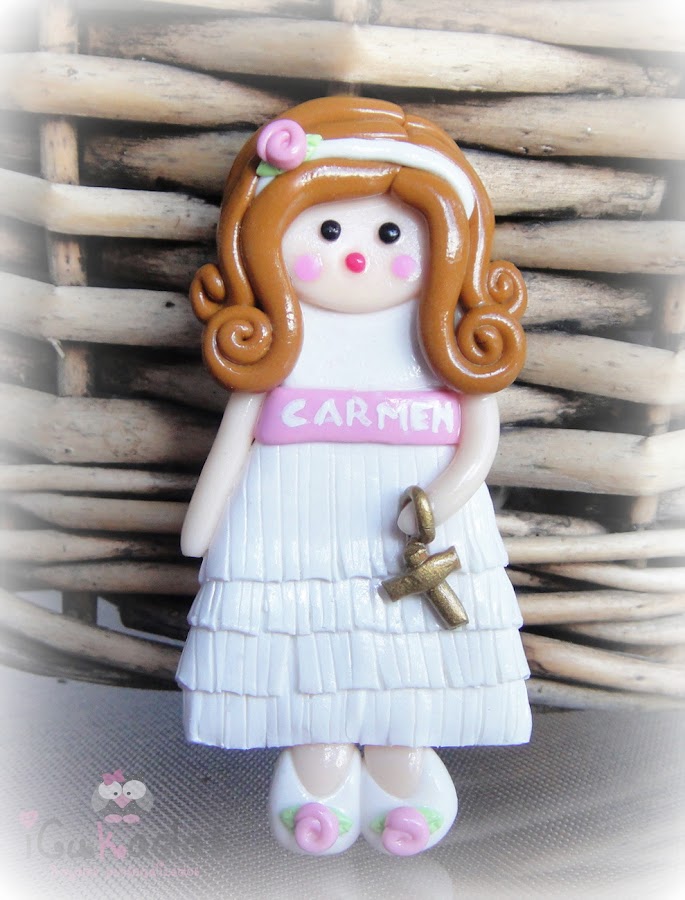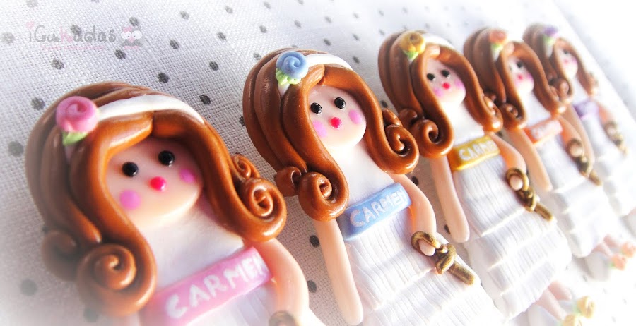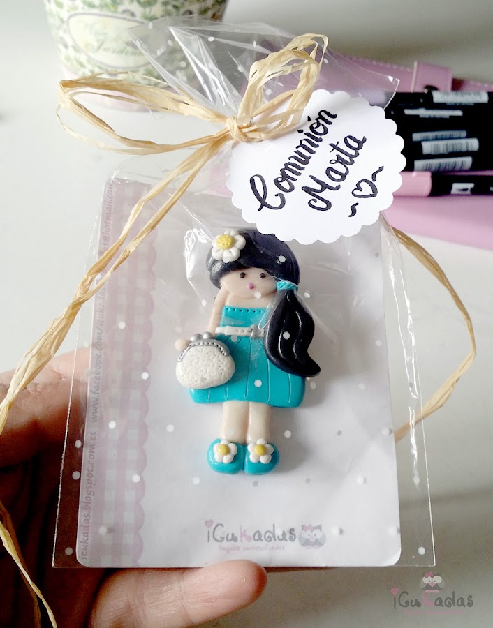 Las muñecas vestidas de comunión son de lo más socorrido. si quieres algo más clásico, personalizadas unas Cukas y listo. Las puedes pedir como broches o como imanes y con el color de pelo de la peque y su vestido. Que lleven su nombre o no, tienes varias opciones.