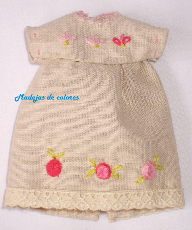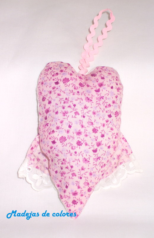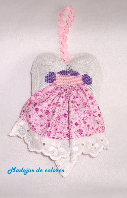 Y para terminar, un corazón con un traje bordado a punto de cruz el cuerpo y la falda con la misma tela del cartel. Para colgarlo una piculina rosa.