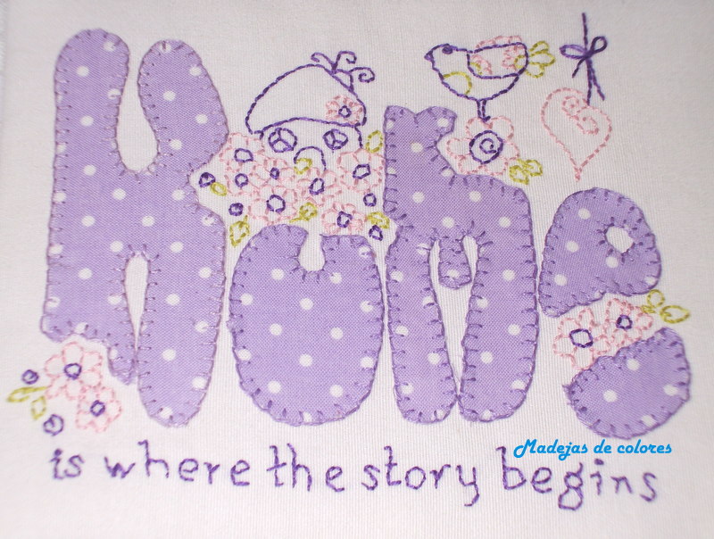 Las aplicaciones son a festón y los dibujos bordados a punto atrás. Una foto más de cerca para apreciar tanto detalles como lleva (casita, flores, pájaro, corazón...). Y la leyenda, que viene a decir algo así como "El hogar es donde la historia comienza"
