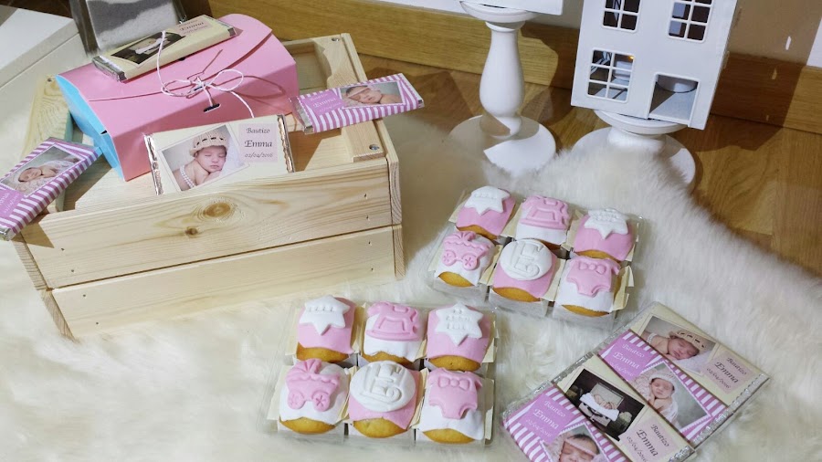 Hicimos dos detallitos: unas chocolatinas personalizadas con la foto de la niña y un texto con los "ingredientes" muy chulo que podéis ver más abajo. Y unas mini magdalenas decoradas con fondant.