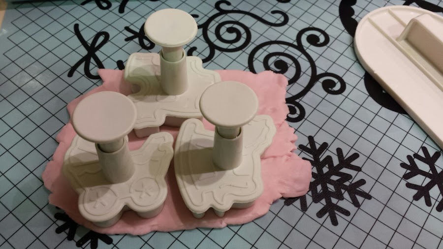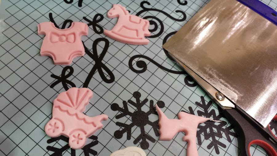 Y sobre ella pusimos el motivo que queríamos pero del color contrario. Es decir, si en la base pusimos fondant blanco, sobre éste poníamos el cortante elegido en color rosa.
