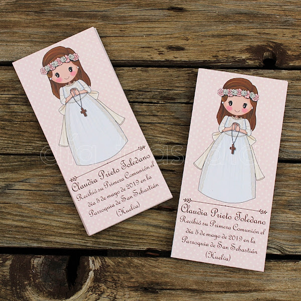 Raquel se puso en contacto conmigo porque quería que le preparara varios detalles para entregar en este día tan especial para ellos. Y quiso que los detalles fuesen con dibujo personalizado de Claudia.