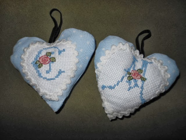 También me encantan los saquitos de olor para los armarios, estos últimos que he preparado, como ya sabía para quien serían, pues les he bordado la inicial a punto de cruz .