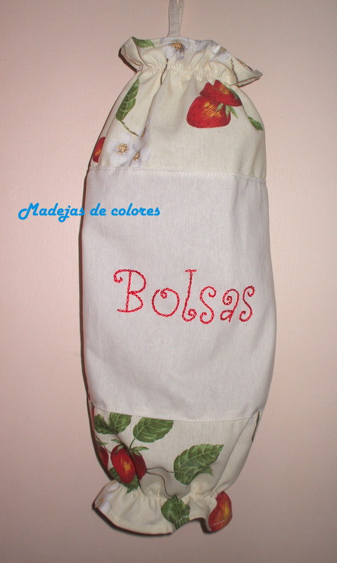 Un práctico también guardabolsas con un bonito y apropiado estampado de frutas para adornar la cocina, lástima que no se pueda apreciar bien con el plegado. Lleva bordado a punto cadeneta "Bolsas".