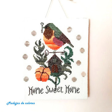 Cuadro para colgar tras la puerta como bienvenida a punto de cruz, jugando con el degradado de colores.