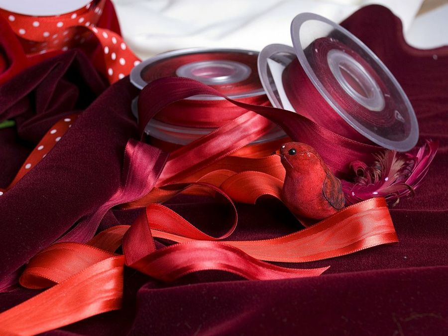 Las mercerías ofrecen un abundante surtido de cintas, con variedad de tonos, anchos, brillos y texturas. Serán el elemento más sugestivo en vuestra cena de San Valentín, puedes utilizarlas para poner lazos rojos a las servilletas, las copas, las velas y cualquier objeto que se preste.