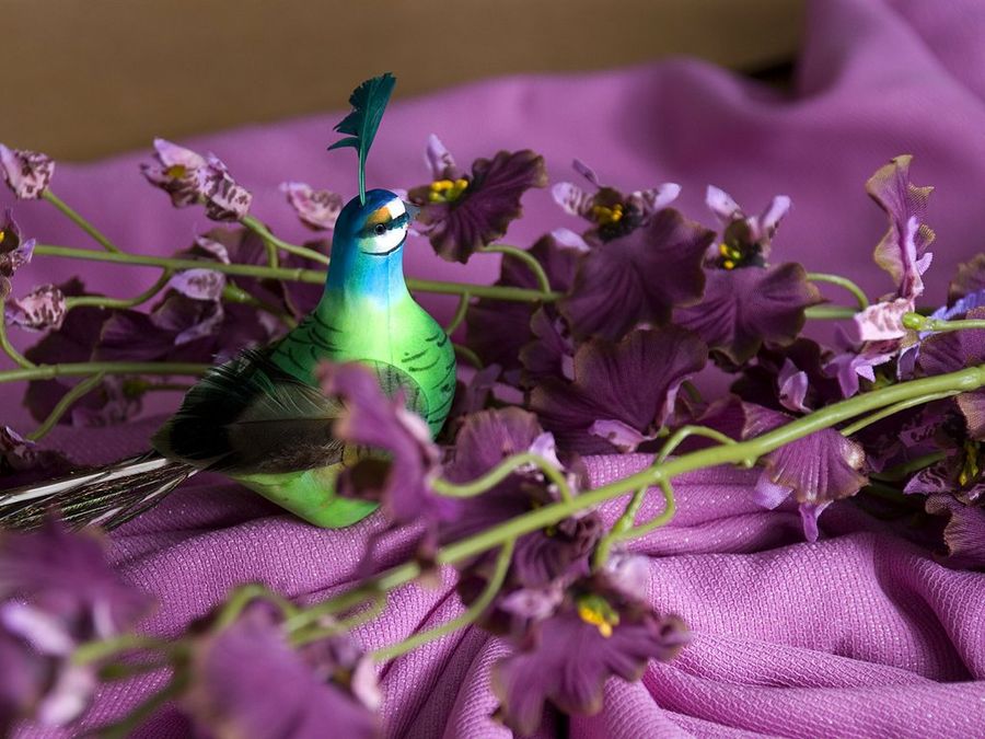 Y finalmente señalamos otro elegante adorno que complementará muy bien un delicado montaje decorativo en tu cena de San Valentín: ramitas con hojas de tela pintadas de color rosa. Con ellas podrás disponer pequeñas escenas, por ejemplo un entorno silvestre de fantasía con un pequeño pavo real, heraldo de la sofisticación y la intimidad. Dos cualidades que hemos explotado a fondo con nuestras puestas en escena.