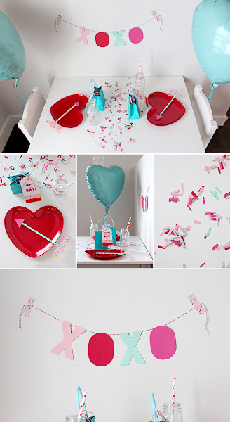 Comenzamos con ideas para la decoración, esta me parece requete divina, por la mezcla de colores, materiales, texturas, todo!, de hecho me ha servido de mucha inspiración porque la fiestecilla de San Valentín que estoy haciendo tenía como colores el típico rojo pero además había añadido el rosa y el turquesa, combinación que me chifla.