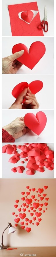 Para animar la pared y llenarla de amor, corazones de cartulina en 3D, super fáciles de hacer.