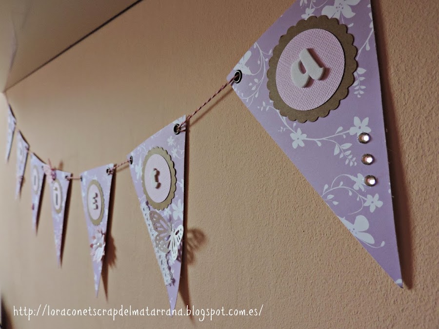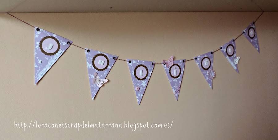 Y por último, una guirnalda de papel, para otra de las paredes de la habitación, con el nombre de la "peque" y también decorada de la misma manera, mariposas y otros detalles, a conjunto con los colores de la habitación...