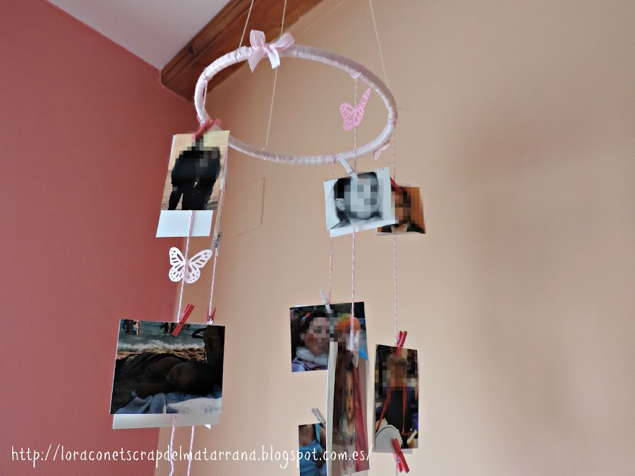 En segundo lugar, cogí un bastidor de mi madre, que tenía de hace mucho tiempo cuando bordaba, y lo decoré con cinta rosa y lazos, y luego unas mariposas troqueladas. Colgué con pinzas de madera blancas y rosas las fotos de la familia que quería colgar y....walaaaaa!!! listo!!!!!