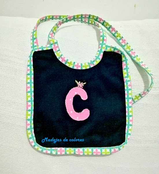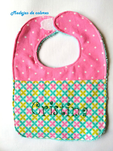 Unos baberos que le hice a la cajera del supermercado donde compro, que ha sido mamá. Con unos colores bien alegres y personalizados. Uno bordado y felpa verde menta en la trasera.