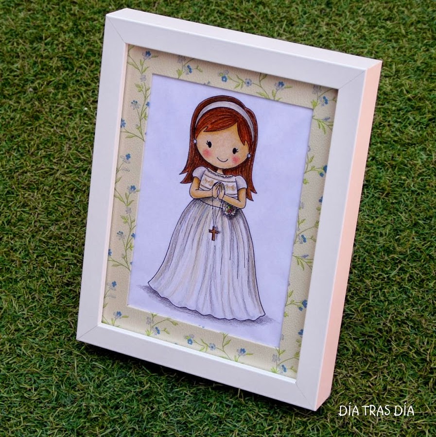 El dibujo lo hice por encargo de mi amiga Mónicapara usarlo como imagen en los recordatorios de Primera Comunión que su hija entregará en ese día tan especial. Cuando me lo planteó, pensé que podría quedar bien la idea de hacer un dibujo coloreado a mano, por darle un toque diferente del de los recordatorios que suelen verse normalmente, hechos con programas de diseño gráfico. Que los hay preciosos, no me vayáis a malinterpretar, pero así me parecía que le daba un toque más cálido y personal al detalle.