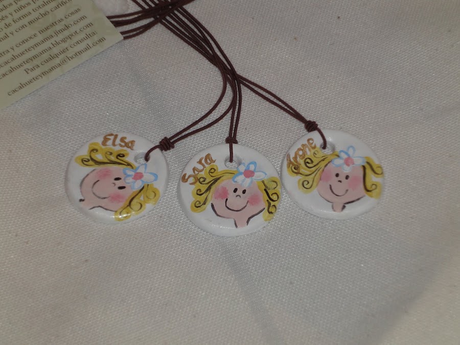 Estos son los collares personalizados que les hice, están hechos con pasta de modelar blanca, y pintados a mano. Llevan cordón elástico.