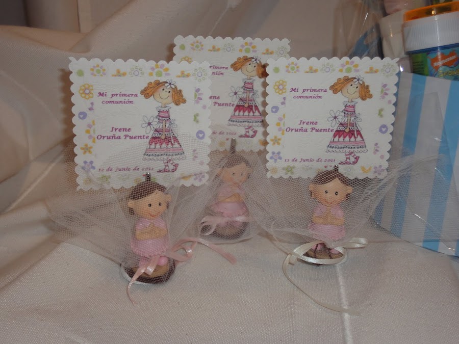 Las medallitas se las metí entre tul blanco, y lo adorné con unas figuras de comunión que compré, quedó muy gracioso.