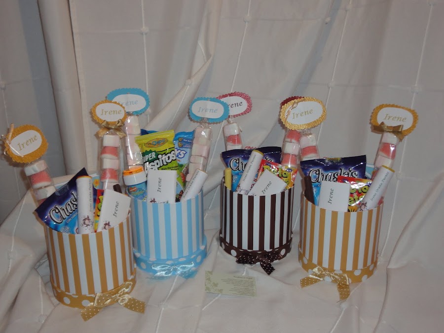 Estas son las chuches...presentadas en cajas de cartón, adornadas con lacitos, brochetas personalizadas incluidas, cada una del mismo color que la caja, con detalles como lazos o papel de relieve.