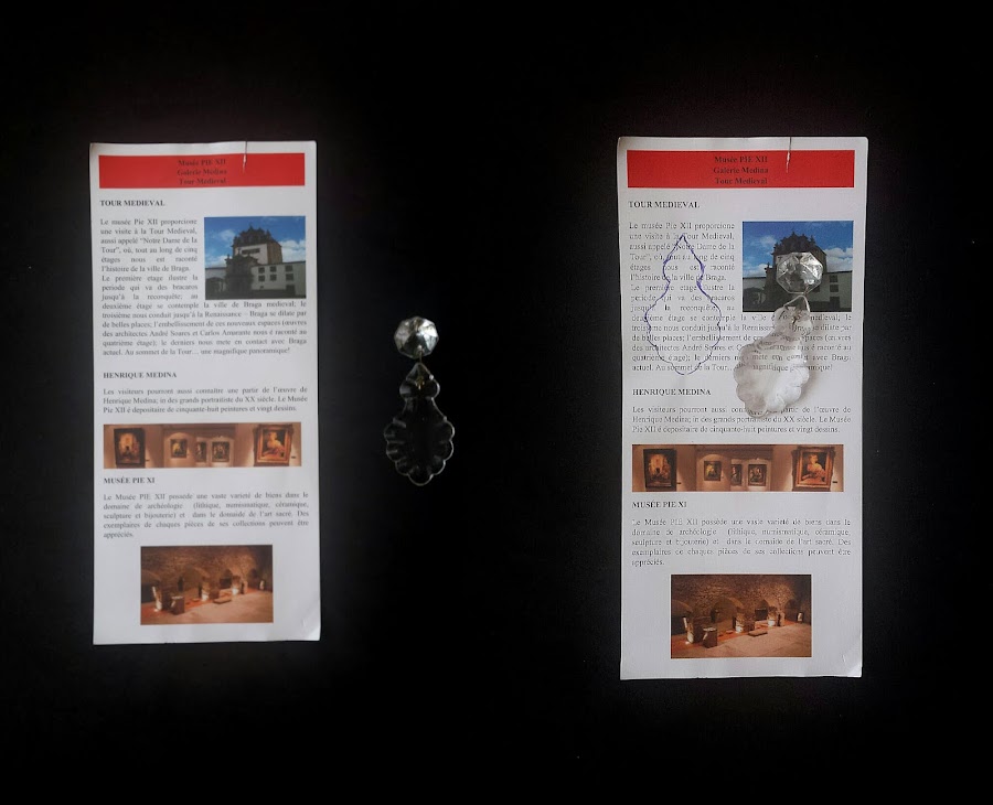 Entonces busqué un folleto que tenía de Braga de este verano en el que la información estaba traducida a varios idiomas. Me interesaba texto en francés. Lo siguiente fue muy fácil. Trazar la silueta de la lágrima sobre el folleto para pegarla en la parte trasera,