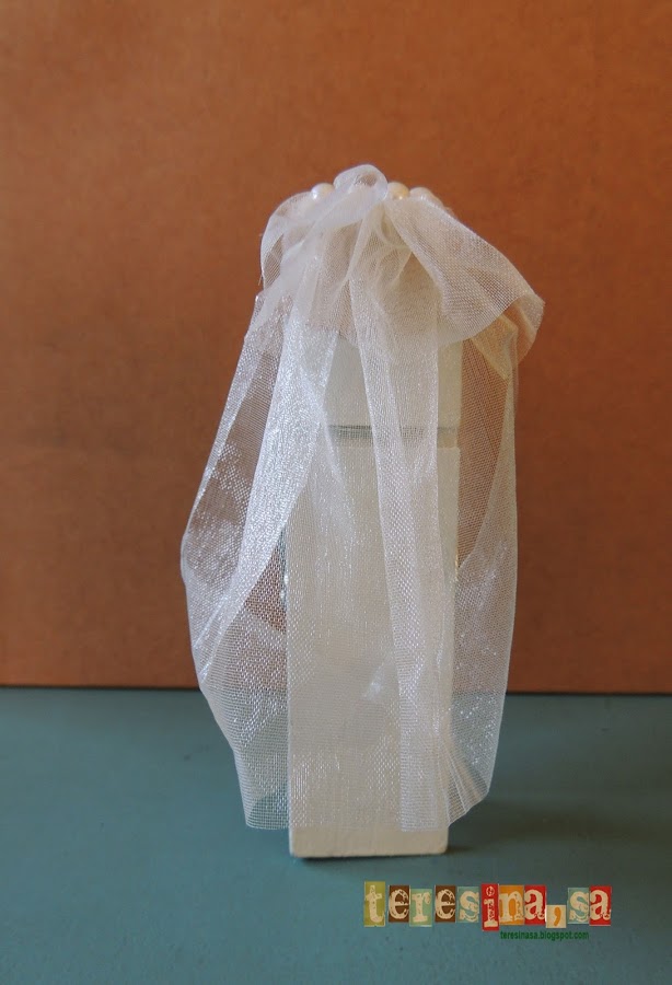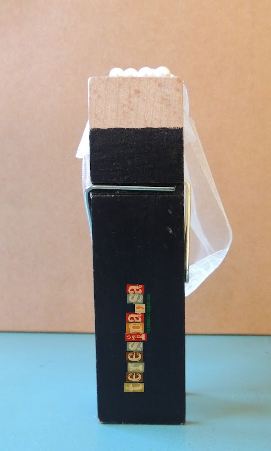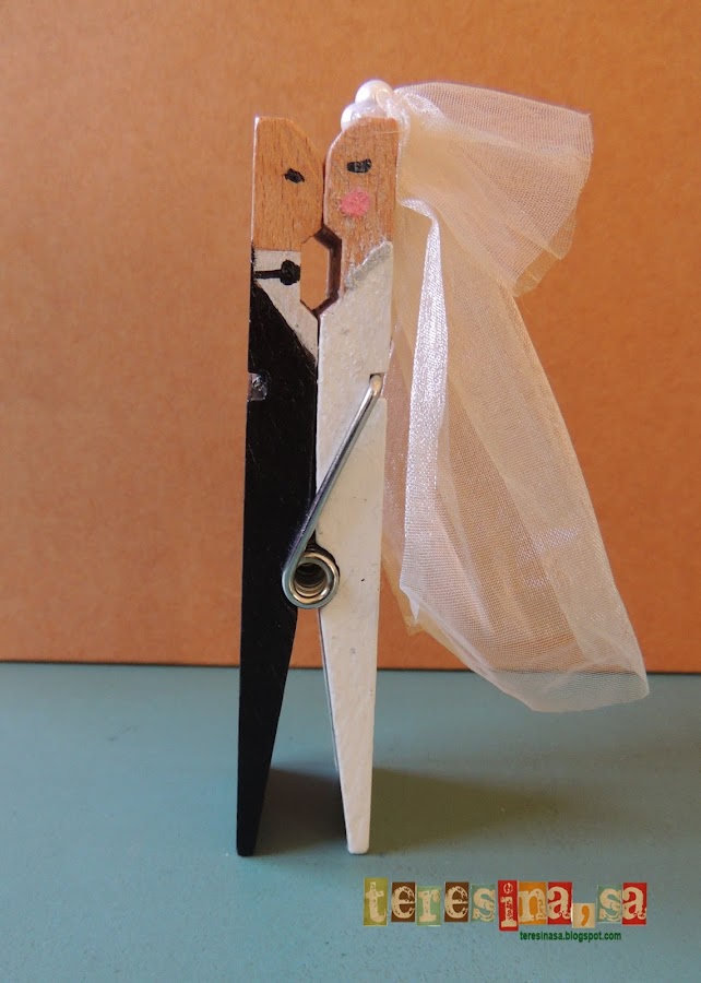 Em vaig posar a buscar per la xarxa i, desprès d"unes quantes hores i desenes de blogs vistos, vaig trobar aquests nuvis fets amb pinces de la roba que ens van encantar (a la núvia i a mi).