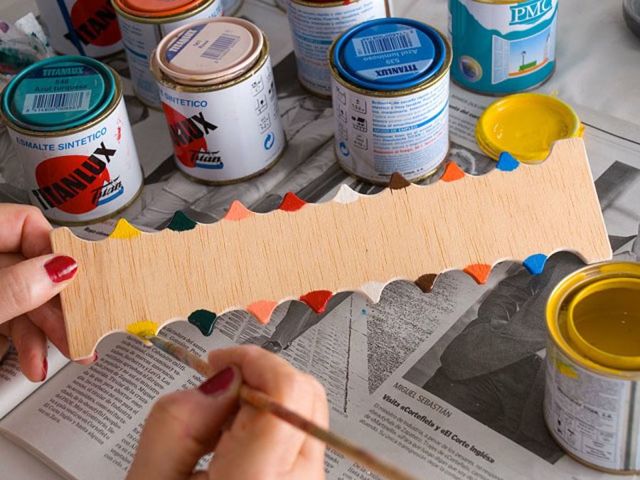 La manera más práctica de organizar los hilos es señalar los colores en el propio devanador. Lo hacemos con esmalte acrílico, usando un pequeño pincel.