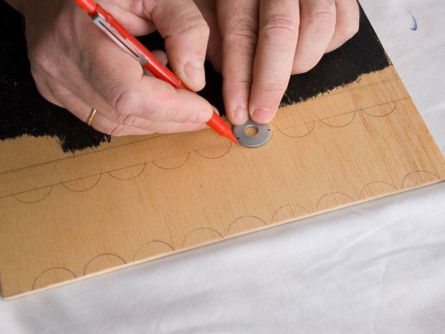 Vamos a fabricar un sencillo devanador, donde podremos clasificar los hilos evitando la molestia de los enredos. Utilizaremos una pieza alargada de madera de balsa, en la que haremos muescas semicirculares por ambos lados. Las marcamos con ayuda de una arandela.
