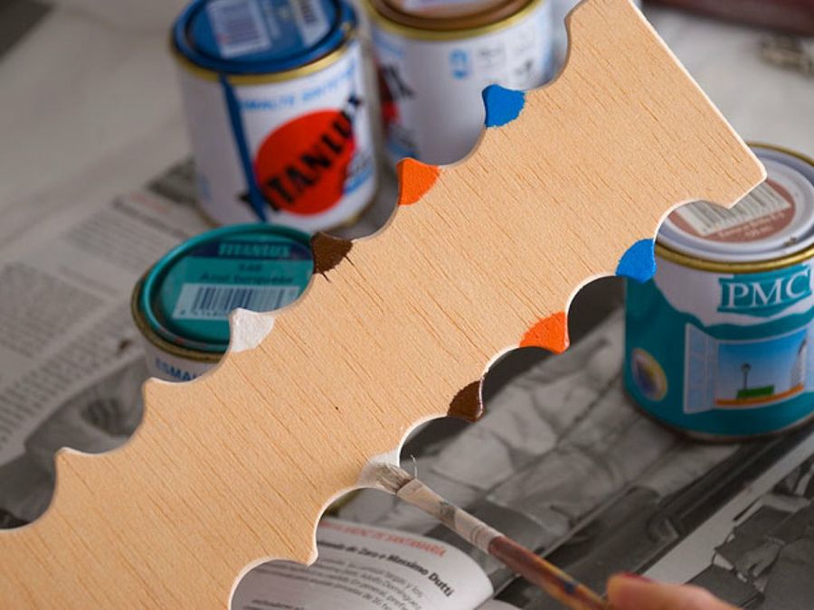 La manera más práctica de organizar los hilos es señalar los colores en el propio devanador. Lo hacemos con esmalte acrílico, usando un pequeño pincel.