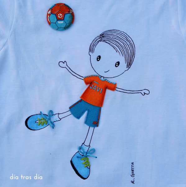 A partir de ahí, decidí repetir la misma idea que ya había usado en la mochila decorada con Dewito portero de fútbol que os enseñé en esta entrada, y la pelota ha sido un broche que se puede cambiar de posición en la camiseta para que su dueño la ponga en el lugar que más le guste: