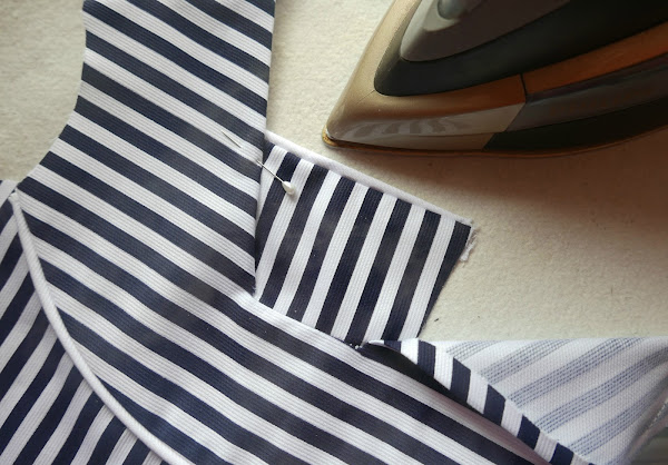 Un truco que os puede ayudar para dar buena forma al escote, aunque la cosamos después: Pasar la plancha para definir la forma del escote para que luego colocar el cuello sea más sencillo.