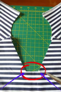 Ahora prepararemos la zona del canesú, donde va a colocarse la pieza del escote. Para ello debemos hacer unos pequeños cortes de medio centímetro, justo en las esquinas de la zona del canesú que se indica en la foto.