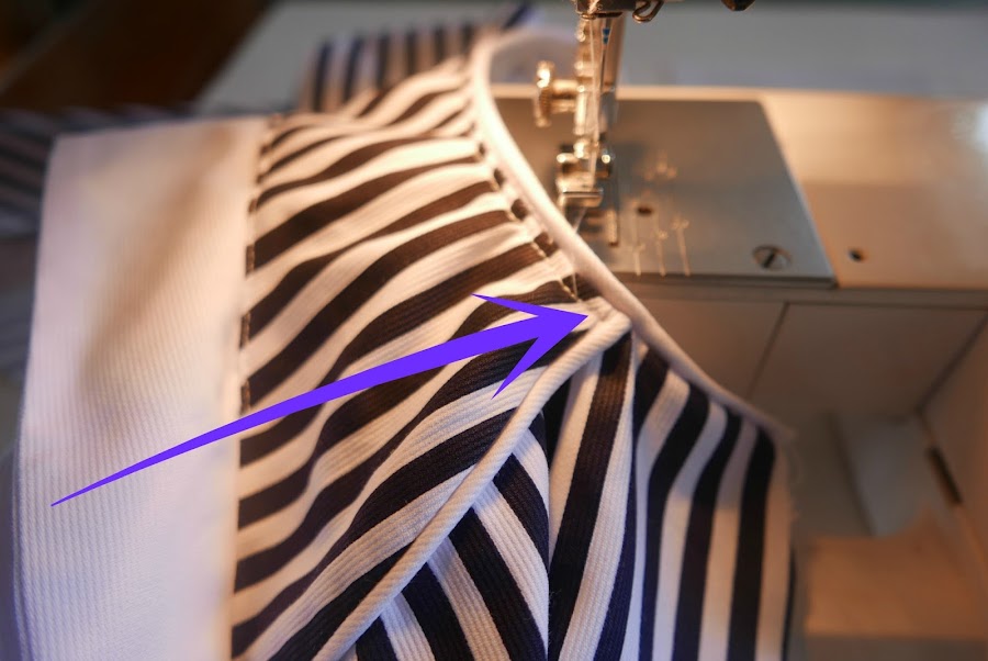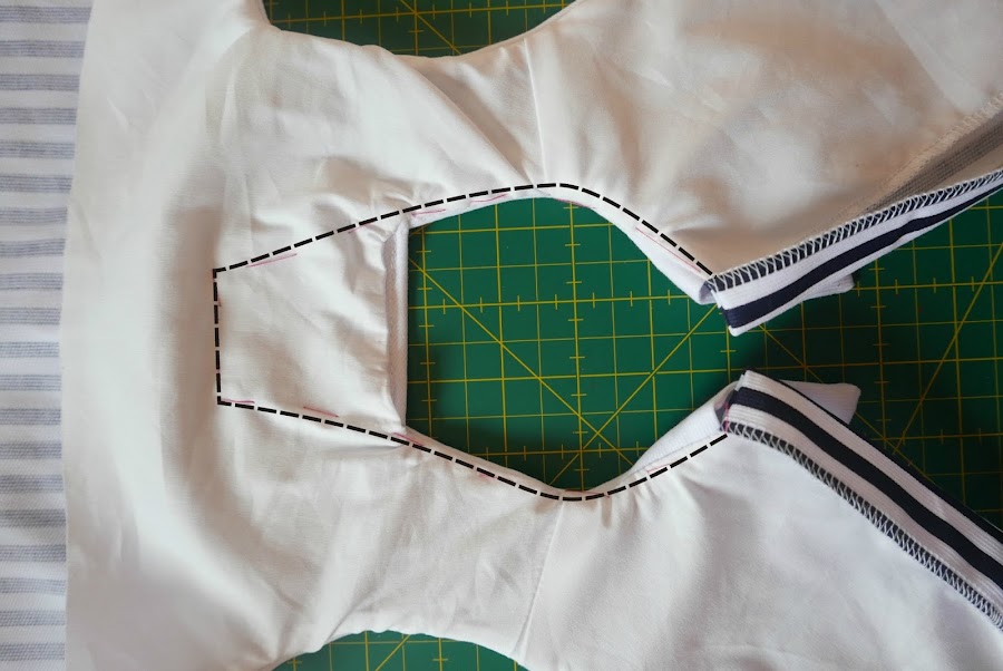 Ahora cosemos la zona de la vista del escote. Lo haremos por el interior de la prenda, es decir por la zona entre el revés de la pieza del escote y el revés de la vista.
