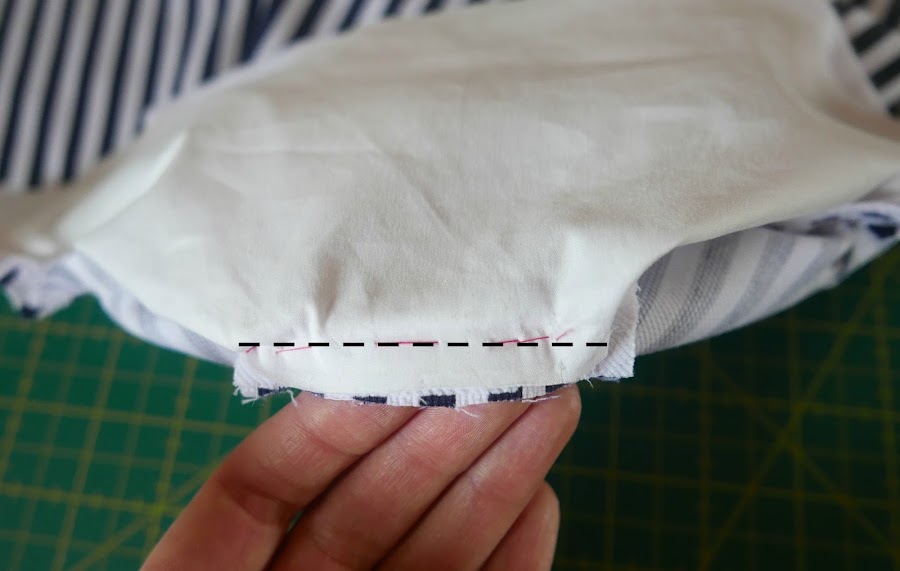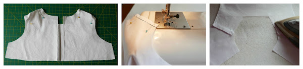 Ahora coseremos las pestañas exteriores de las sisas. Lo haremos sobre la zona del canesú. Haremos allí un parón y después continuaremos con la zona de debajo de la sisa.