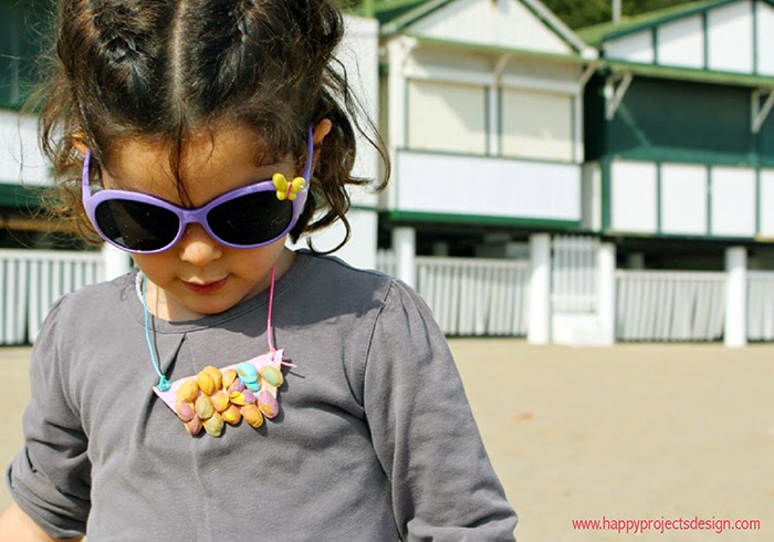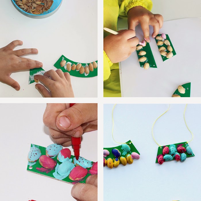 Encontrarás el tutorial de estos coloridos collares en este post. Es tan fácil como pegar las cáscaras en trozos de cartón, pintar y listo ;)