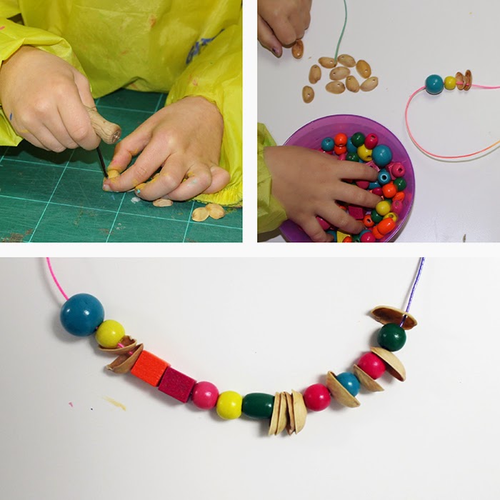 Otra opción es agujerear las cáscaras de los pistachos y combinarlos con cuentas de madera: