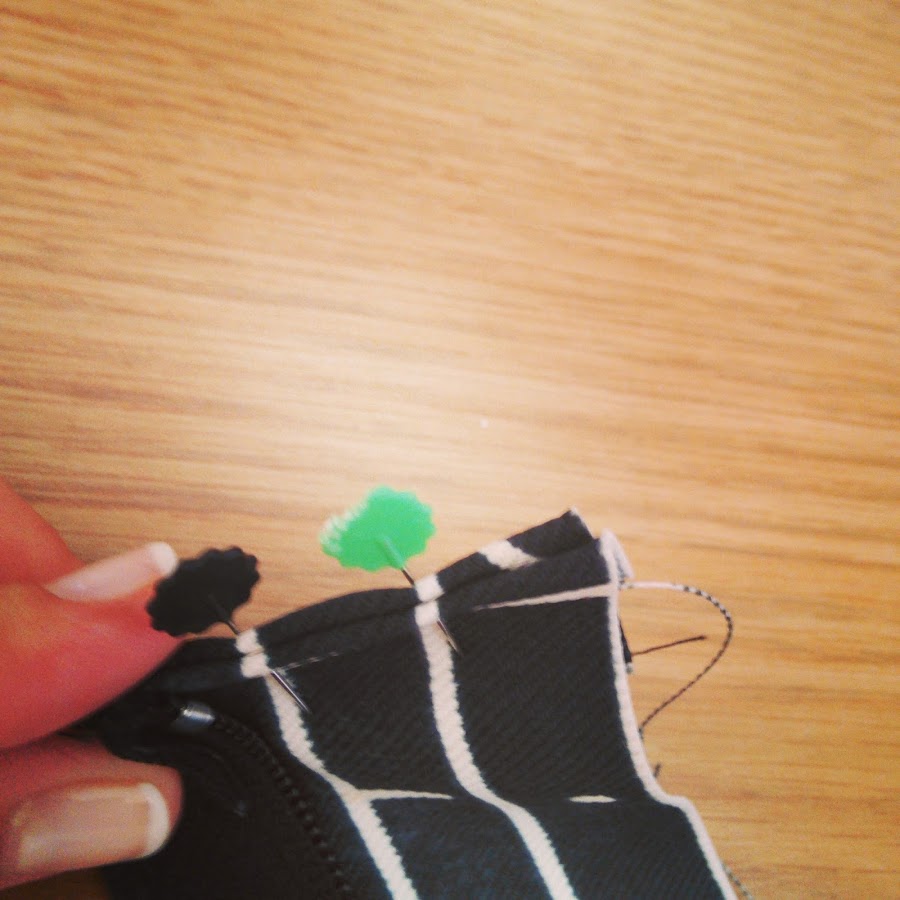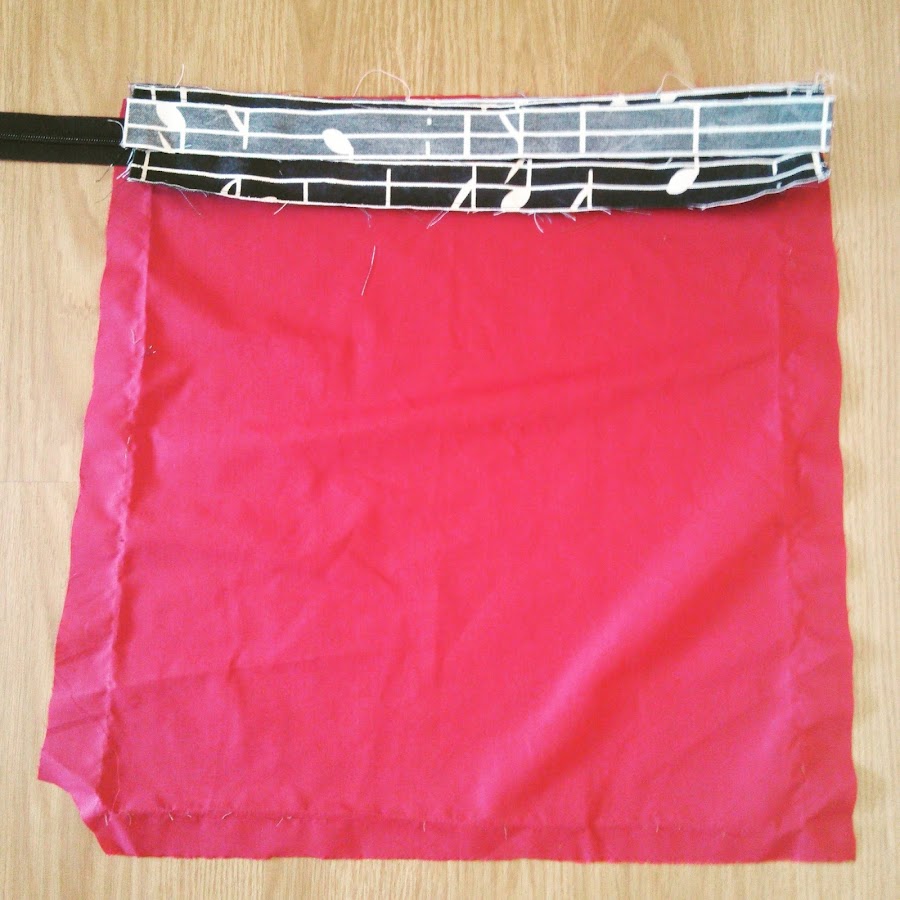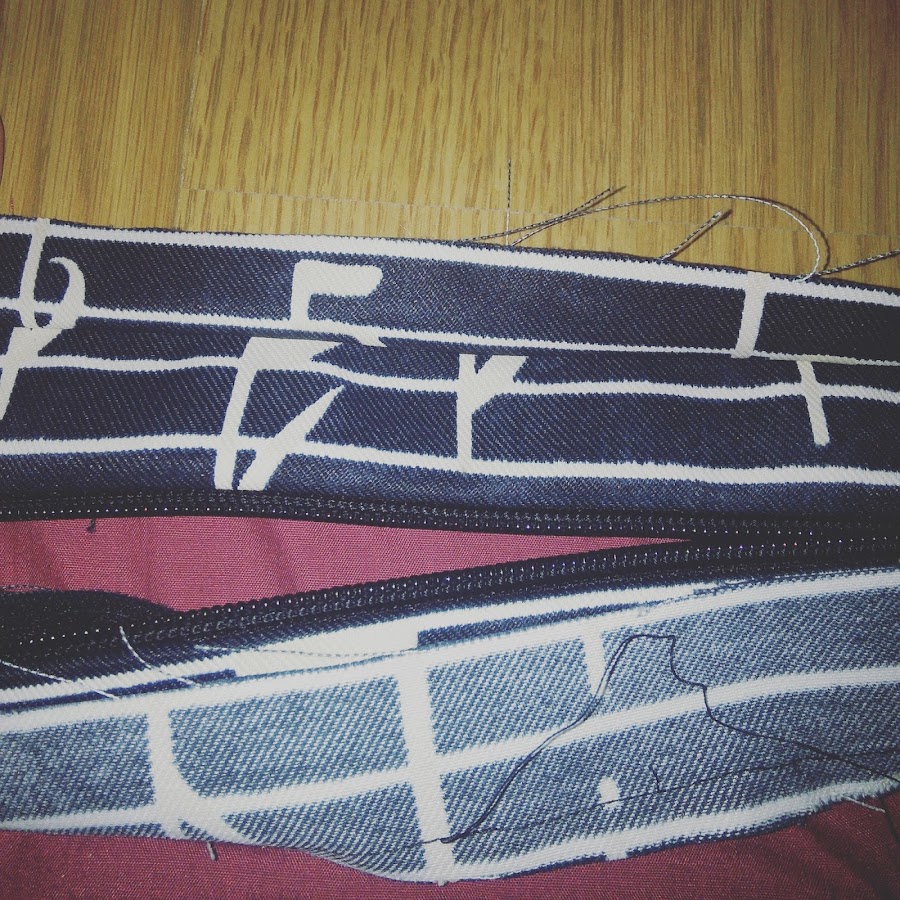 Pasamos a unirlo al forro, coloca derecho de la tira de 4x47 con el derecho del forro y en medio la cremallera, haciendo coincidir, la nueva tira, el borde de la tira que pertenece a la cremallera y el borde del forro y coselo todo junto.