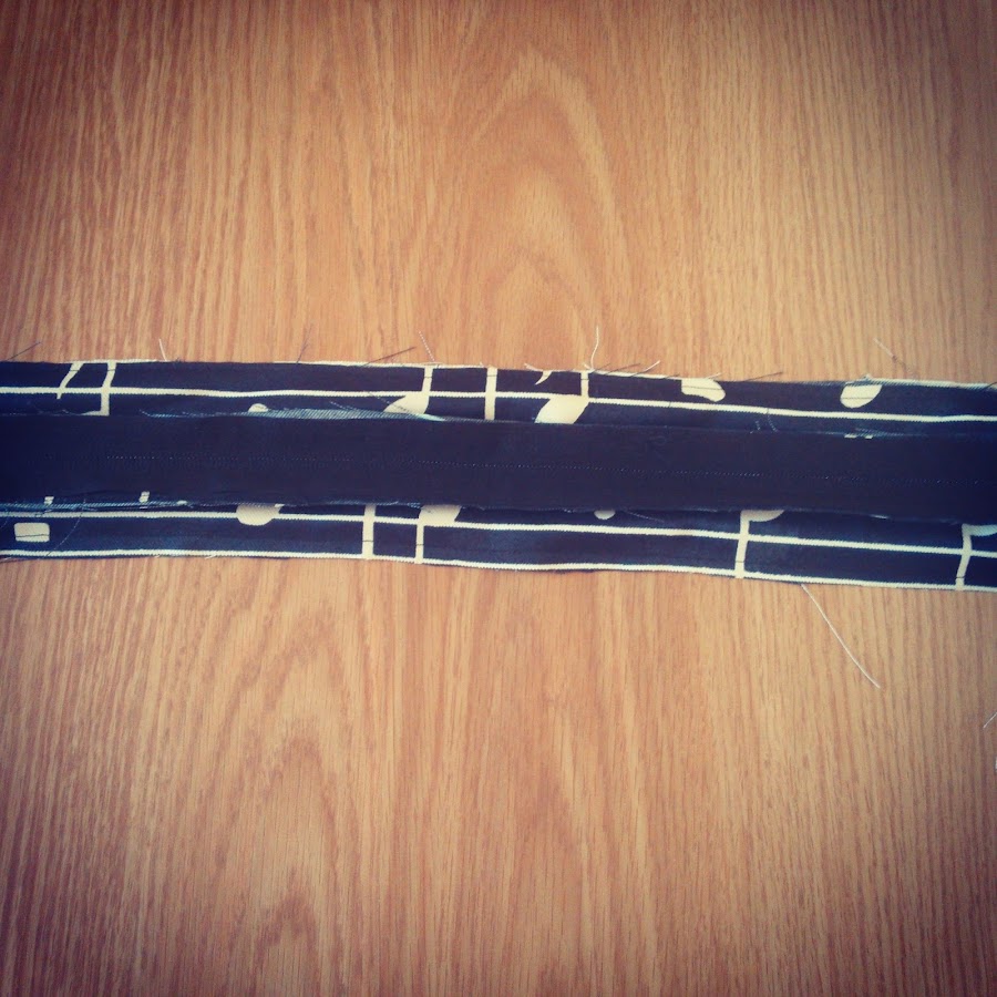 Ahora coje una de las tiras de 5x47 y ponla encima de la cremallera, y cosela lo más cerca de los dientes.