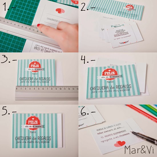 Antes de unir todos los cheques es conveniente rellenar el último, así escribiremos de forma más cómoda. Éste último, lo hemos dejado para que cada uno ponga algo especial y personal. Cada cual conoce a su madre y seguro hay algo que le haría muchísima ilusión.....