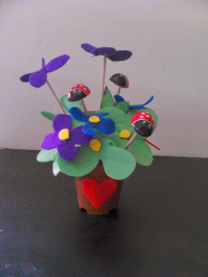 Otro regalo muy original es este, hecho por mi sobrina y su mami. Con trozos de fieltro de diferente color hicieron las formas de flor y mariposa, añadieron unas mariquitas de chocolate, que clavaron cuidadosamente con palillos a una base de corcho dentro de una mini maceta.