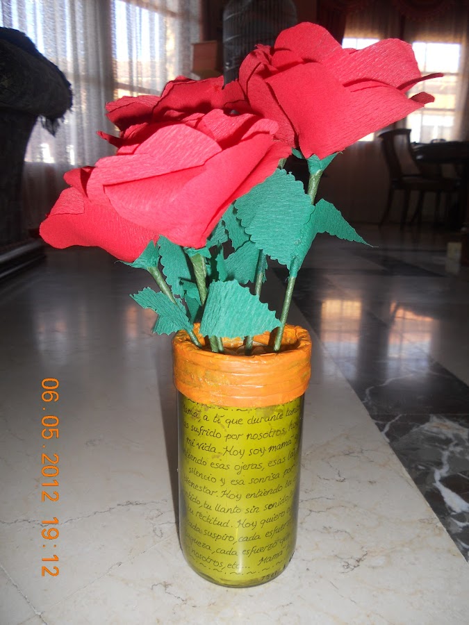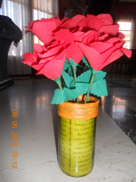 Esta rosa se la hice a mi madre con 13 cucharillas de plástico, de las de usar y tirar...y quedó muy bonita. La coloqué en una macetita hecha con serpentinas recicladas (Ya subiré fotos).