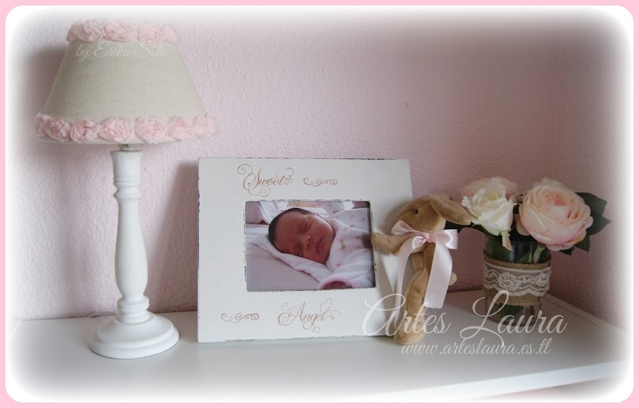 El porta fotos fue el que le hice a laura hace algún tiempo, que lo pinte desgastado tipo vintage y estampando unos sellos con taz on. y el florero es un vaso típico de bar donde nos ponían los cuabatas jejeje lo decore un poco y pose unas florecitas...