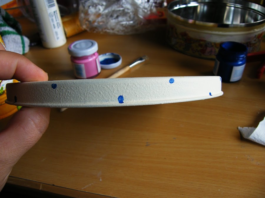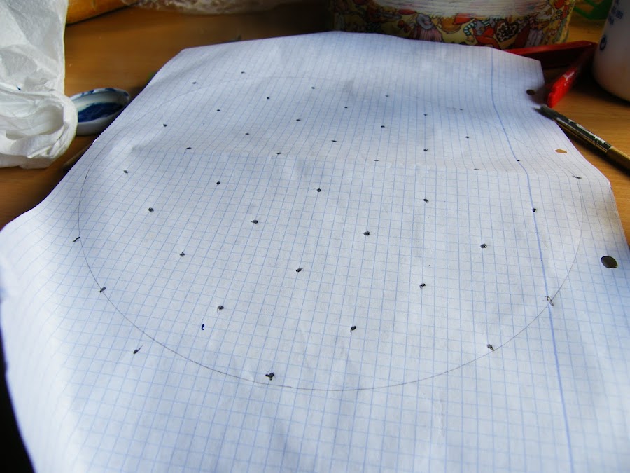 Antes de poner los motivos de decoupage, con una plantilla hecha en un folio, marqué unos puntitos y los pasé a la tapa con un papel de calcar,