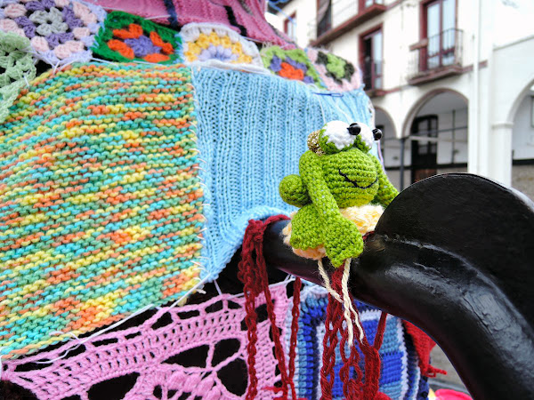Manuela vino desde Torrelavega con sus hijos y nos trajo un montón de sorpresas, retales preciosos, la bandera de Laredo tejida y una rana príncipe la mar de divertida, para poner encima de algún caño de la fuente ¿Que os parece? jejeje, a mi me encantó!!
