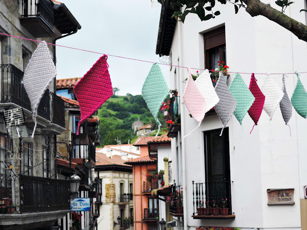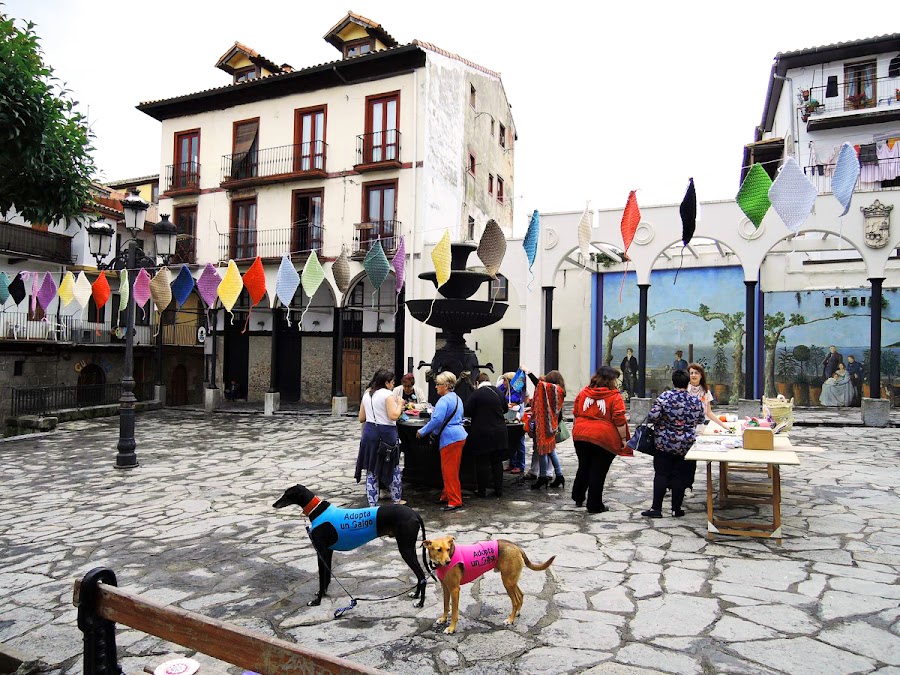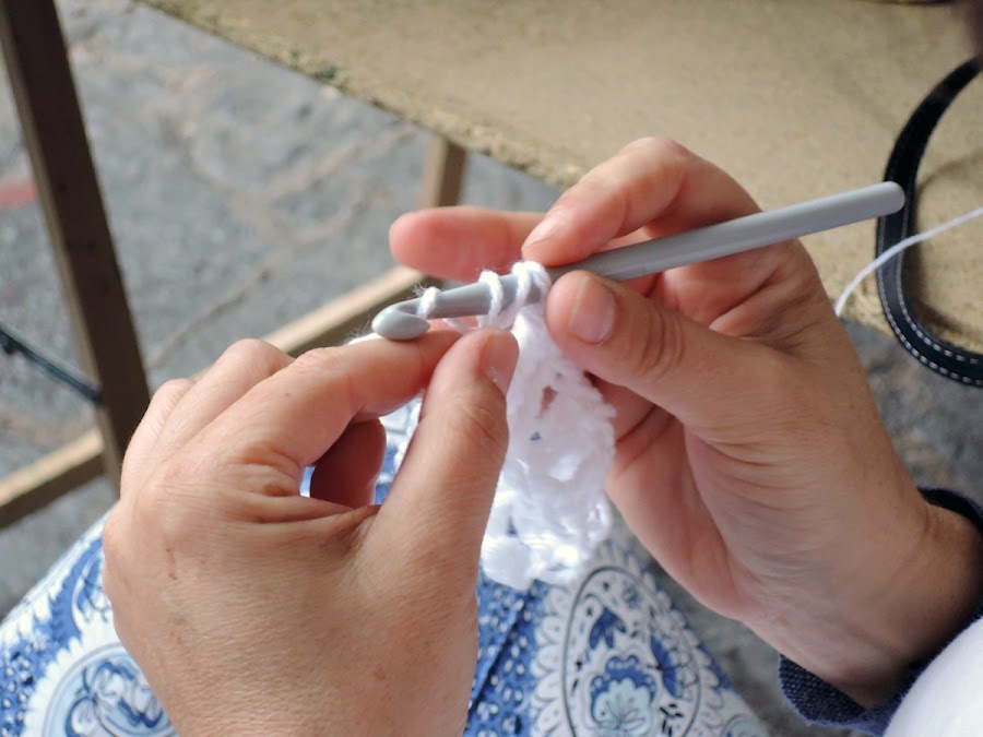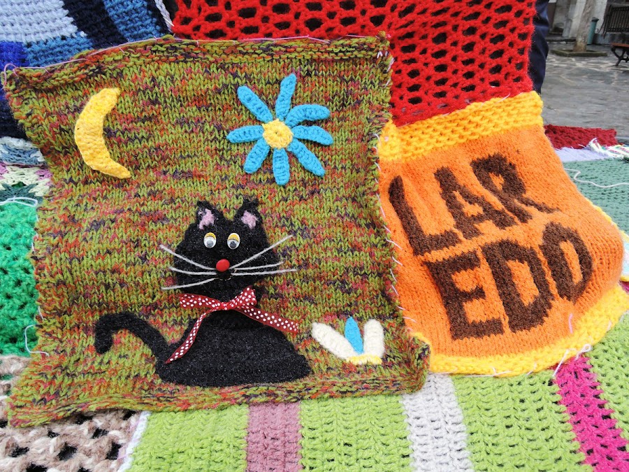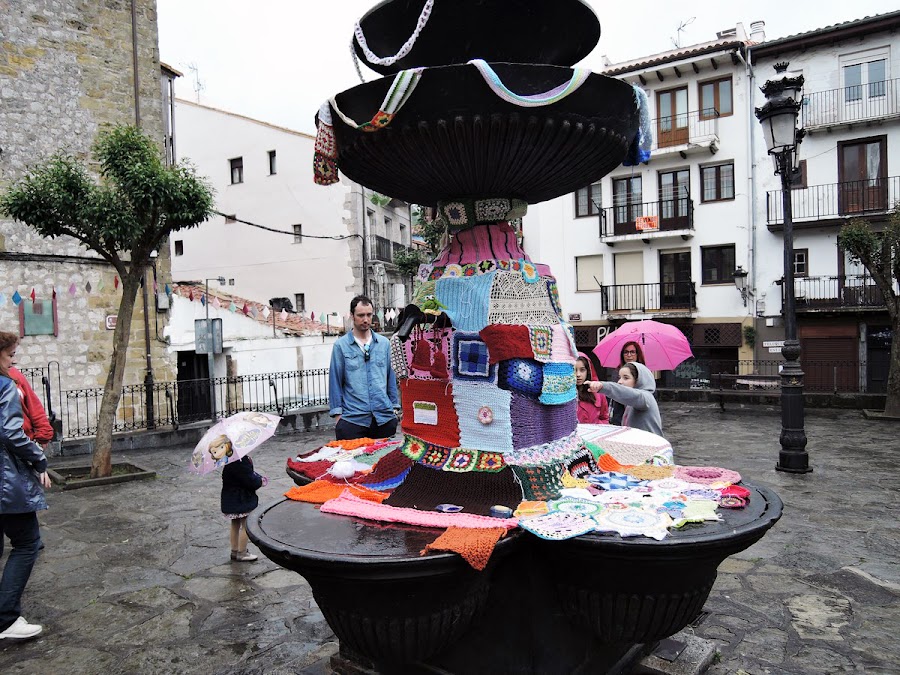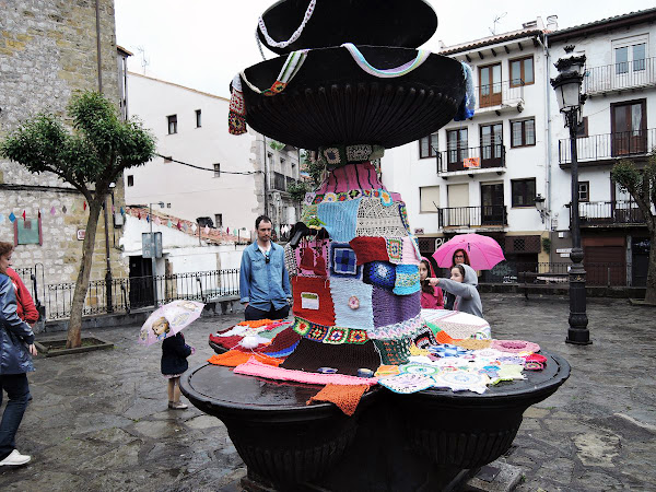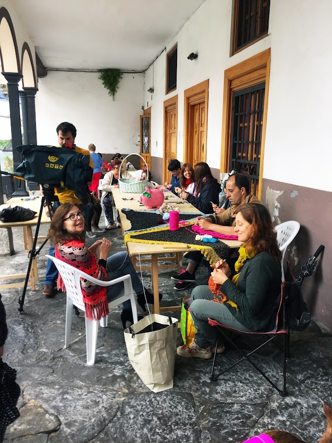 Pero empezaron a caer unas pocas gotas, y luego, unas pocas más, así que trasladamos todo debajo de los soportales de la plazuela, y ahí se sentó todo el mundo, compartiendo la mañana, puntos y formas de tejer, enseñando habilidades y trabajos realizados, gente que se conocía entre si y completos desconocidos haciendo de una mañana gris un montón de colores de lana.