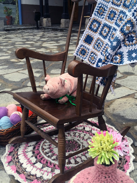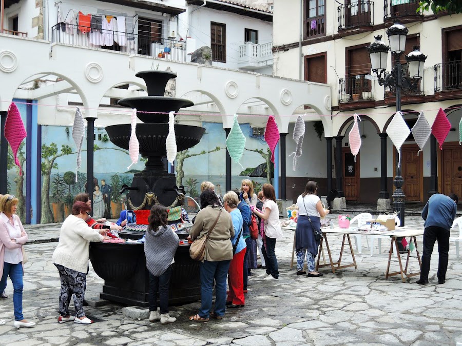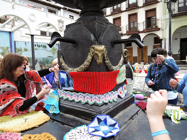 Ya teníamos colocados los trabajos de la exposición, el forrado de la fuente había empezado y algunas personas iban enseñando a otras como coger una aguja o utilizar el trapillo para hacer una cadeneta gigante, todos colaboraban y había caritas de felicidad, sobre todo la mía!!!!