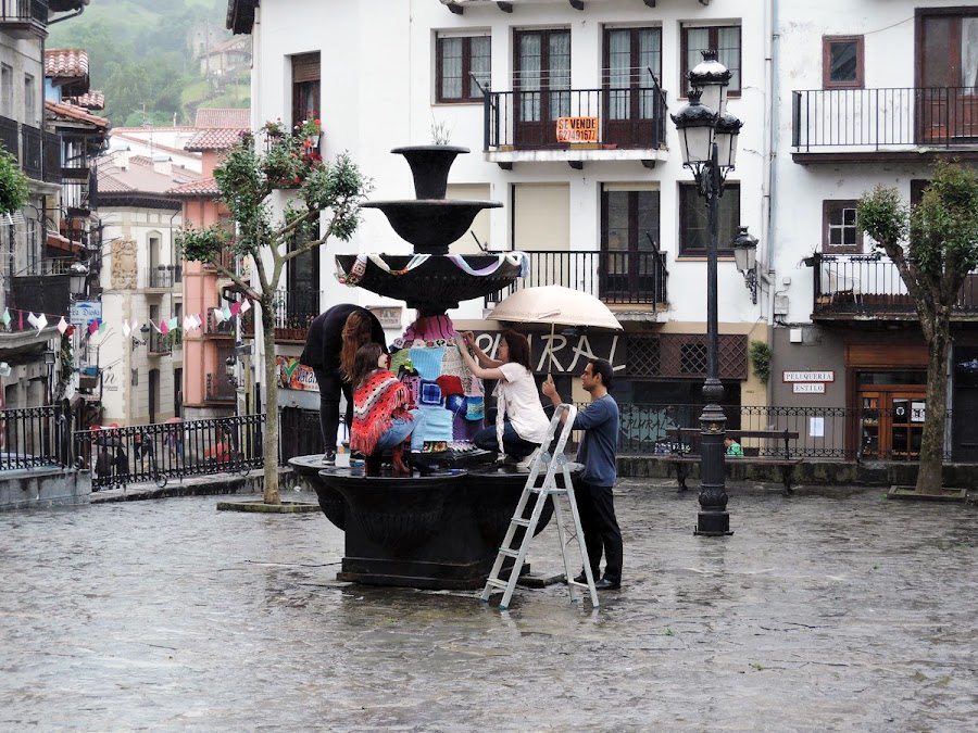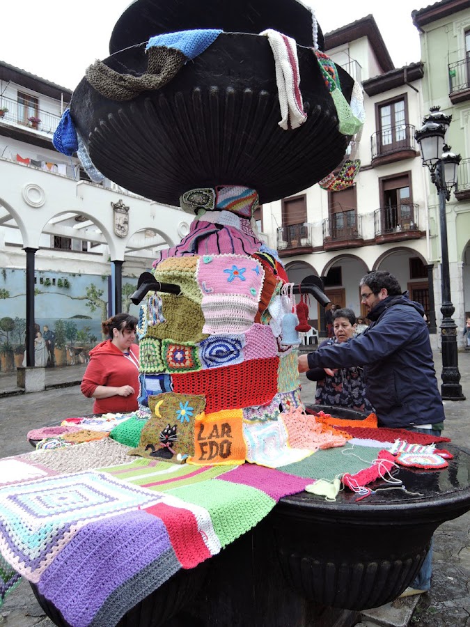 Varios valientes “atacaron” la fuente con lanas, retales y agujas, a pesar de la lluvia, nos subimos a una escalera, y seguimos cosiendo y cosiendo. Empezaron a llegar periodistas, diario Montañés y la Agencia EFE, nos grabaron en vídeo, hicieron un montón de fotos chulas y entrevistaron a unas cuantas personas, Chelo, una de mis chicas, Luis, el único chico de los talleres, ( a ver si se animan más!! ) y yo.