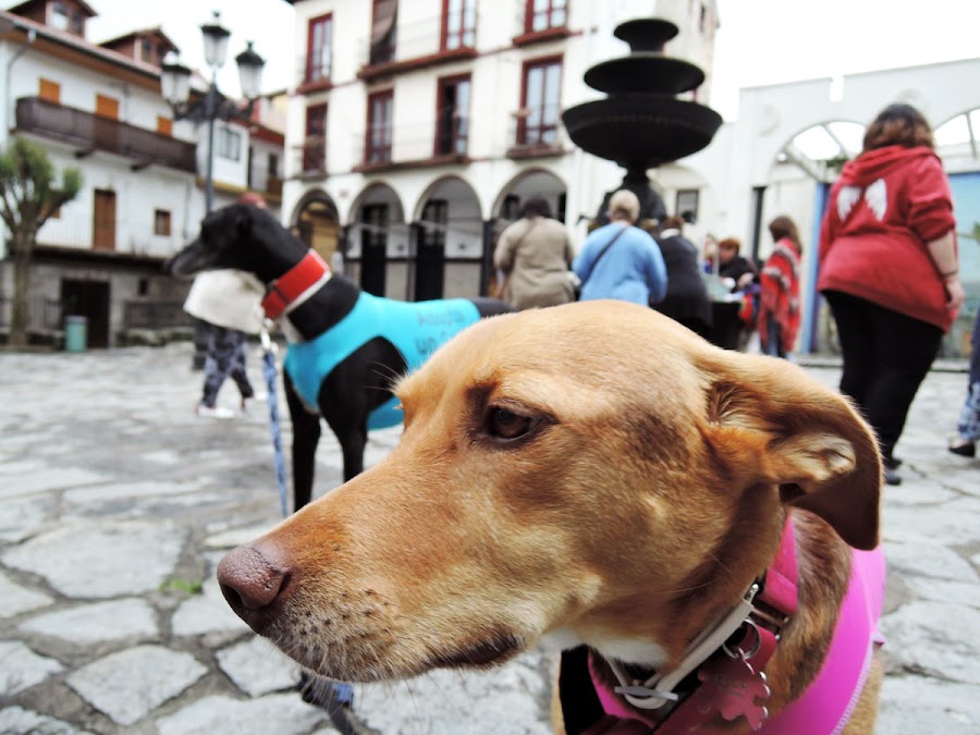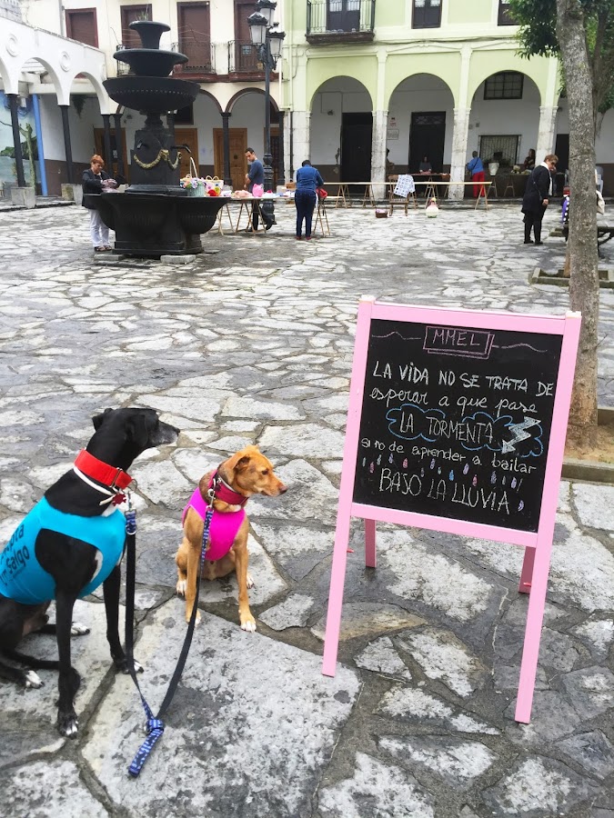 Quedé con mis chicas del taller prontito, para tomarnos un café caliente y empezar con fuerzas. Llegamos a la Plazuela y empezamos a distribuir todas las cosas, tableros, sillas, colgamos banderines de ganchillo, y empezamos a sacar los retales que me habían ido trayendo. Teníamos dos acompañantes muy especiales, dos amigos que se llaman Guda y Frodo, dos peludos encantadores que nos ayudaron en todo lo que pudieron y que además nos dejaron un mensaje muy importante, a todos los que amáis a los animales! adoptar!!!! que hay muchos corazones perrunos que necesitan cariño y están muy solos.