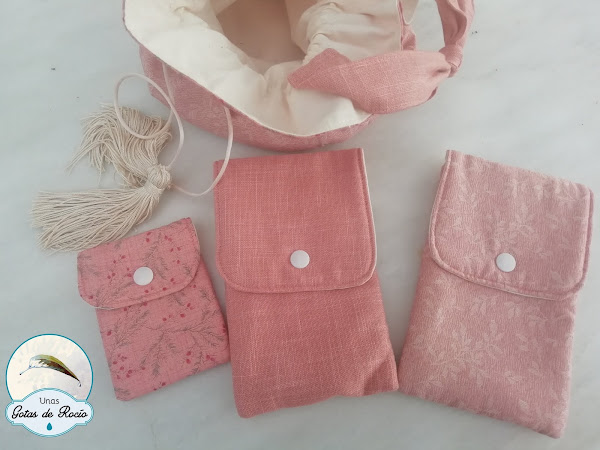 Bolsito bombonera con dos borlones en el cierre, asa de mano con lazada para regular altura y varios accesorios a juego: funda de gafas, de móvil y tarjetero.