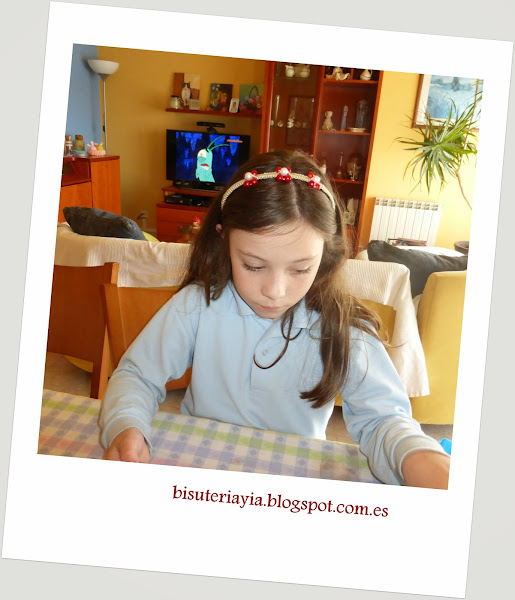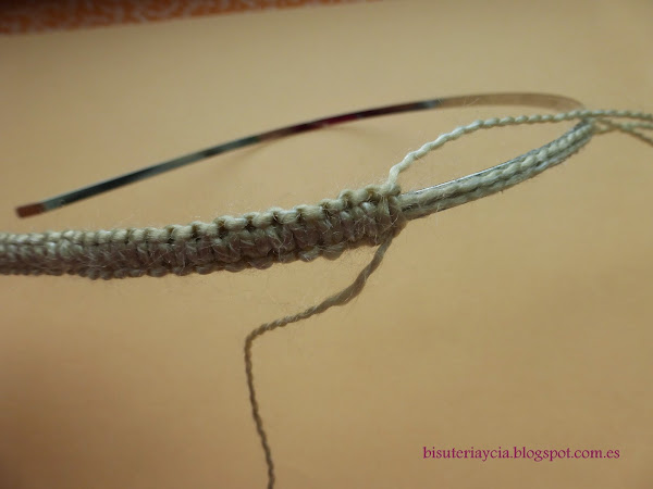Empezaremos forrando la diadema con hilo, podéis hacerlo con el que mas os guste, solo tenéis que tener en cuenta que el hilo que utilicéis pase por el agujero de las bolitas.