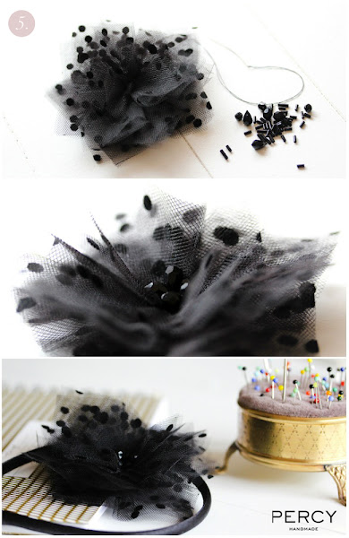 En la pagina de Percy Handmade tenéis el tutorial con fotos para saber como cortar y doblar los trocitos de tela, que luego tendremos que coser a un circulo de fieltro. Decoraremos el centro de la flor con lo apliques y pegaremos a la diadema.