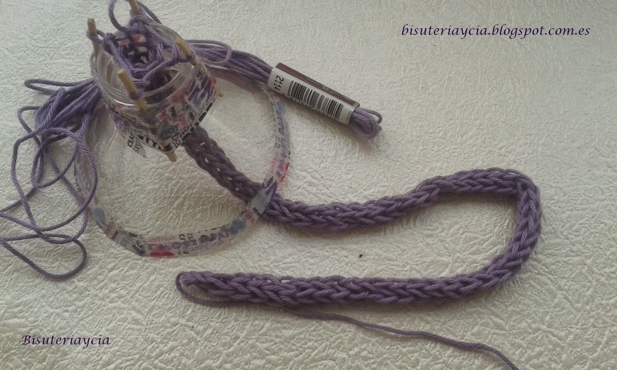 Lo primero es tejer nuestra malla, como podéis ver en la imagen, mi tricotín es improvisado, use para hacerlo la parte superior de una botella, podéis comprar un tricotín en cualquier tienda de lanas.