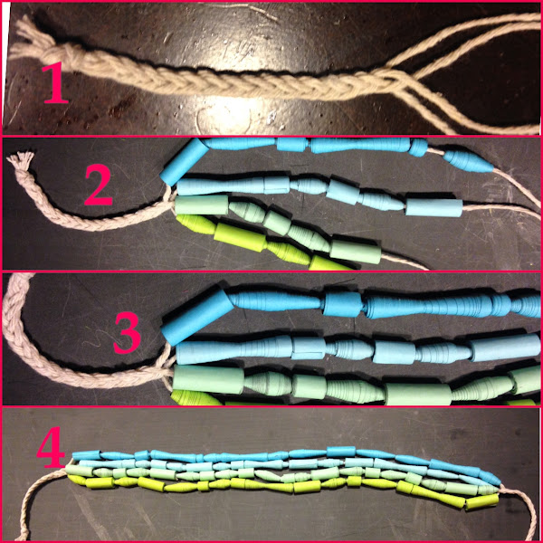 Comienza a enhebrar las cuencas por las cuatro tiras del hilo, por aproximadamente unos 35cm, una ves llegado a este punto comienza a hacer la trenza nuevamente, antes de comenzar une las tiras con un poco de pegamento, y finaliza con otro nudo.